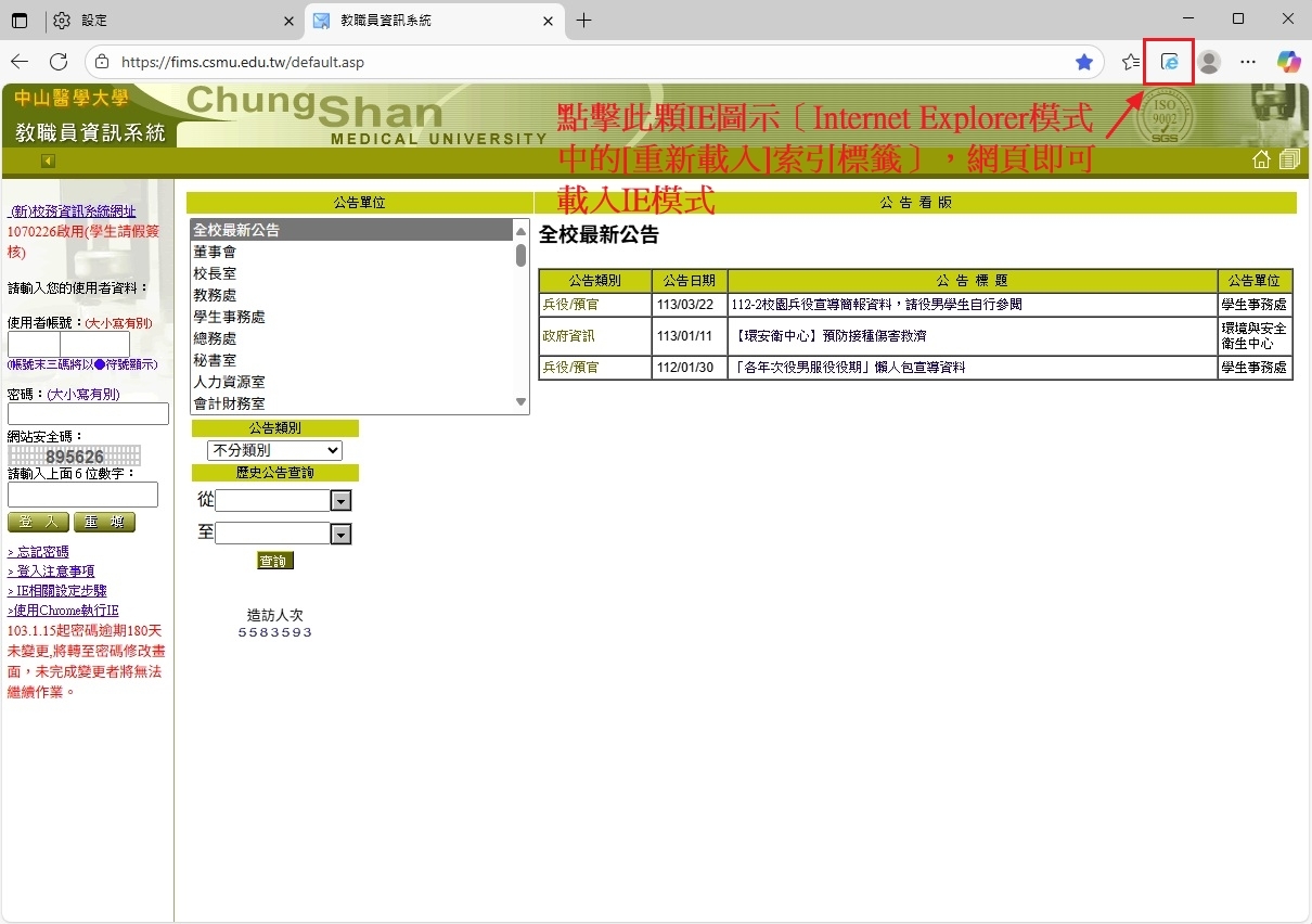 (3-2)回到教職員資訊系統頁面 → 點擊右上角IE圖示(Internet Explorer模式中的[重新載入]索引標籤),教職員資訊系統頁面即可載入IE模式
