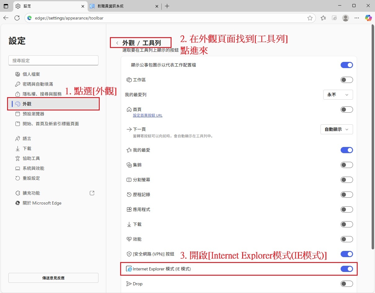 (3-1)點擊右上角[…] → 打開[設定]頁面,接著點選[外觀] → 點擊[工具列] → 找到[Internet Explorer模式(IE模式)]並開啟,工具列將會出現載入IE模式的按鍵