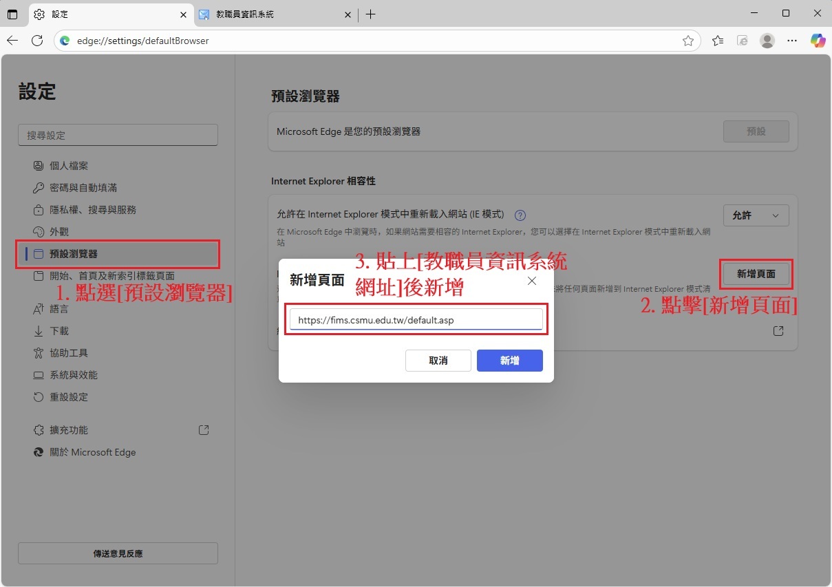 (2)點擊右上角[…] → 打開[設定]頁面,接著點選[預設瀏覽器] → 點擊[新增頁面] → 複製[教職員資訊系統網址]貼上空白欄位後新增。回到教職員資訊系統頁面即可載入IE模式